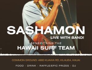 SASHAMON and Band will be performing LIVE at Common Ground 6-9PM on Saturday November 22, 2025. This concert is a special event as it will be benefitting the Hawaii Surf Team. All proceeds benefit Team Hawaii in Peru to compete in the ISA World Junior Championships December 4-14 2025. There will be food, drinks, a DJ, a raffle and EPIC PRIZES! Come be part of the amazing vibe!